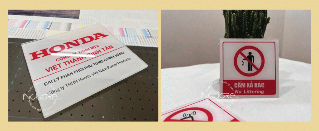 In mica là công nghệ in trực tiếp hình ảnh, logo, nội dung lên tấm mica bằng mực in chuyên dụng. Sau đó, sản phẩm được phủ thêm một lớp bảo vệ giúp tăng độ bền, chống trước tác động từ môi trường.