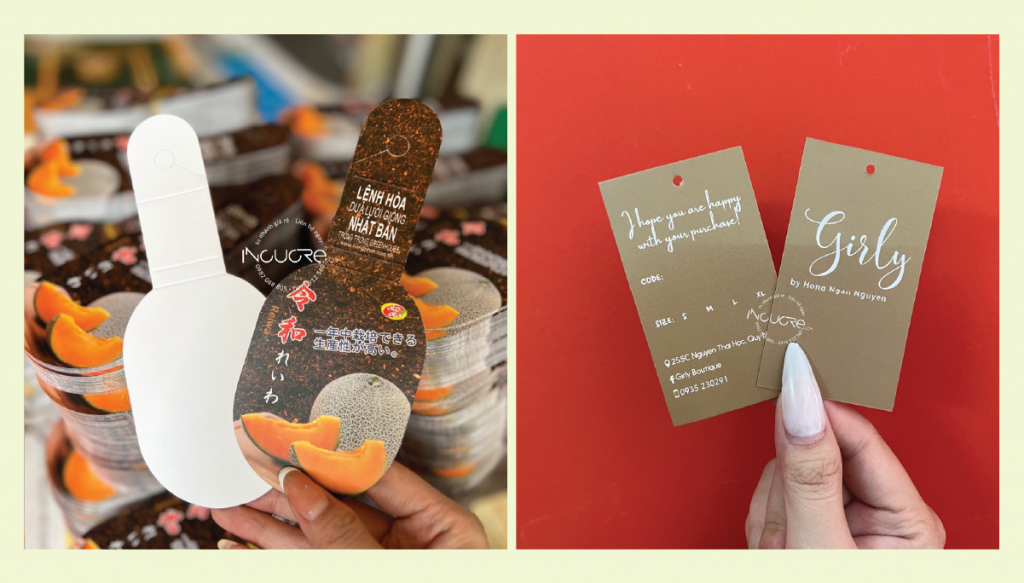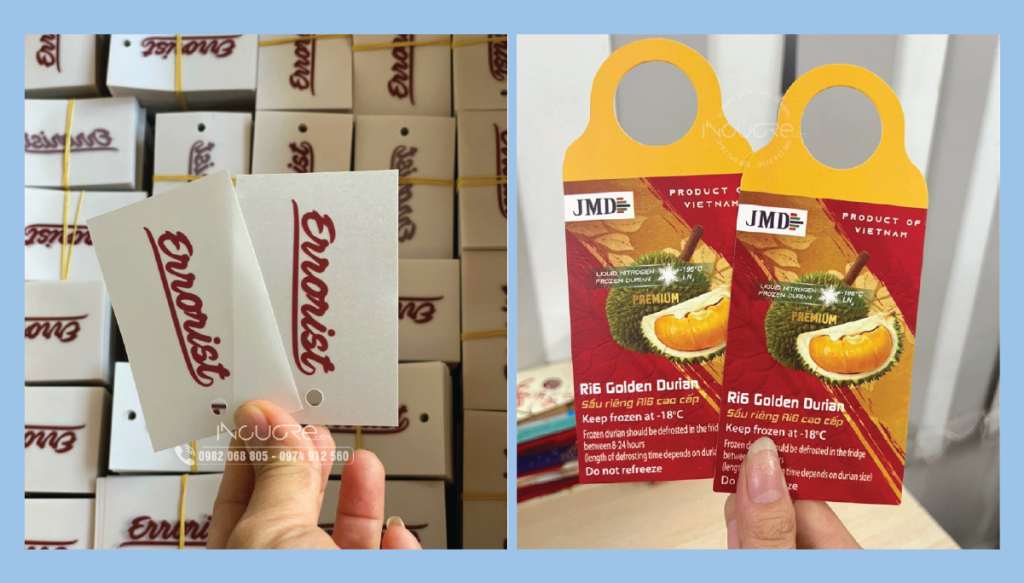 Thiết kế thẻ treo, tag treo, mác treo,… thường được in ra để treo trên quần áo, giày dép, trang sức,… Hay bất cứ sản phẩm nào mà bạn kinh doanh. Mục đích là để thông tin giá cả và đánh mã hàng hóa hoặc mô tả sơ sản phẩm.